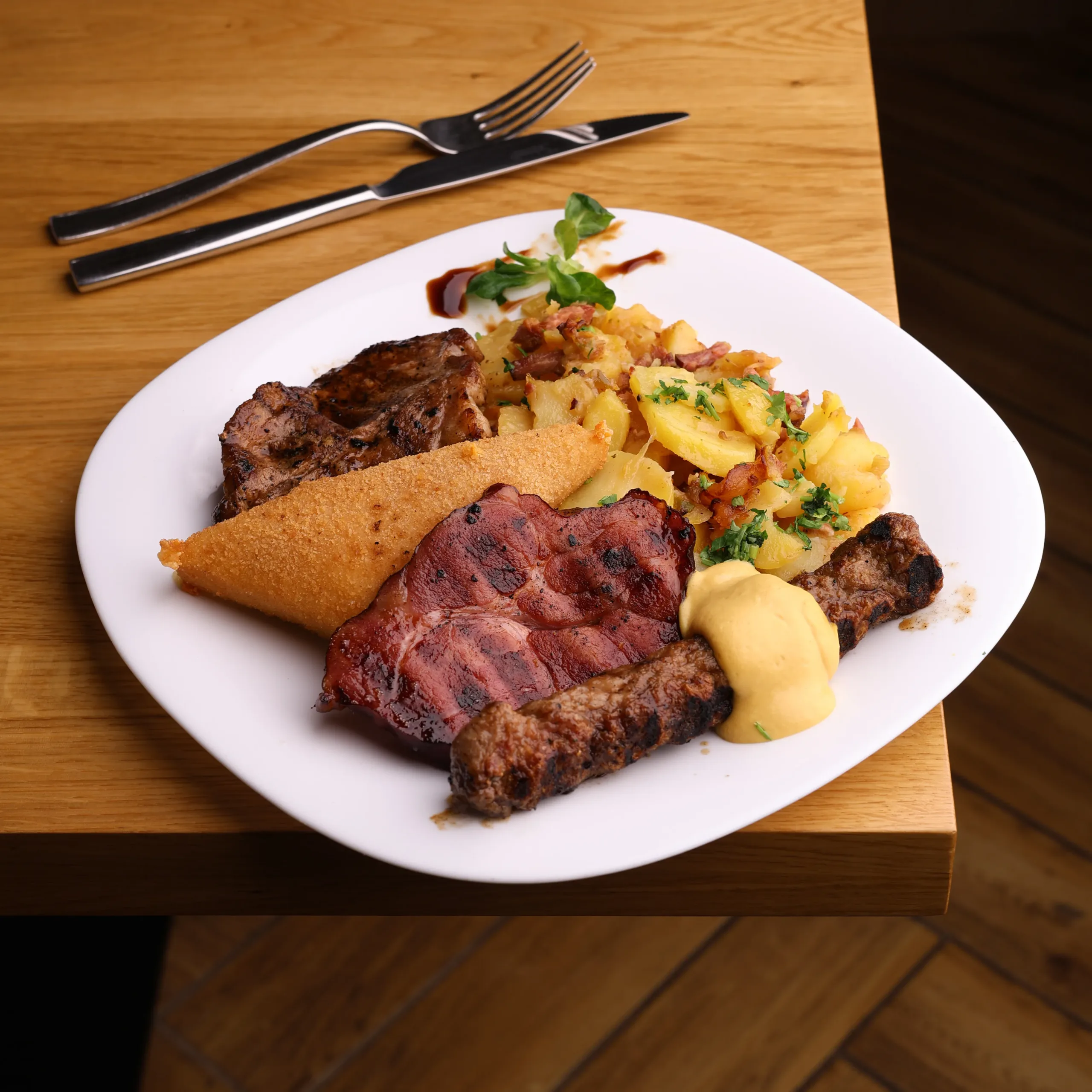 | Garnitură | cartofi prăjiţi, cartofi aurii, cartofi natur, cartofi ţărăneşti, piure de cartofi, orez, legume, mămăliguţă, iahnie de fasole, varză călită, spanac, fără garnitură |
